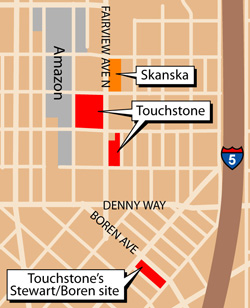 Seattle developer Touchstone Corp. wants to build a 13-story office, retail and hotel complex on Boren Avenue between Stewart and Howell streets in the Denny Triangle.
