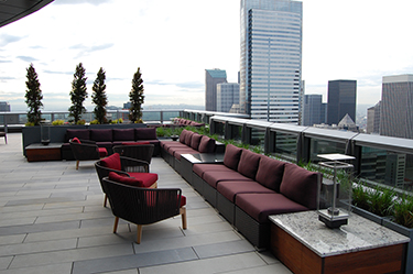 Along the west side are several outdoor seating areas, a large communal table and multiple covered barbecues. Goodman said it's hard to keep outdoor fire pits lit on a high rise, so the team opted for partially encased torch lamps.