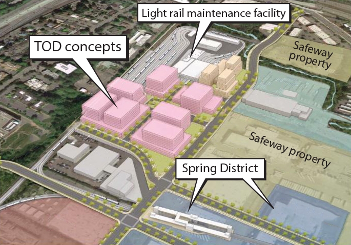 Sound Transit has been talking with stakeholders and others about how to mitigate the impact of a maintenance base on the area, and has studied some transit-oriented development ideas. One concept shows a two-phase project that could add as much as 3.4 million square feet of new development.