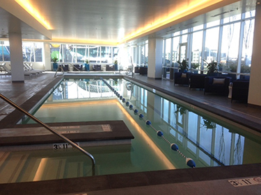 In the podium is a large fitness room and an indoor pool, available to both hotel guests and office tower tenants.