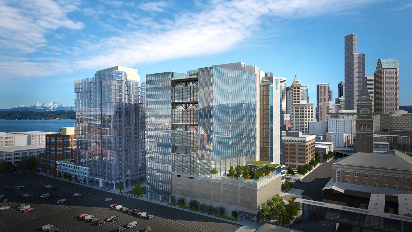 Avalara moved into its namesake building last month, and next Wednesday Embassy Suites will open in the same new development at 255 S. King St. The towers, which share a podium, were designed by Freiheit Architecture (formerly Freiheit & Ho Architects) and built by SoDo Builders. American Life is the owner and developer.