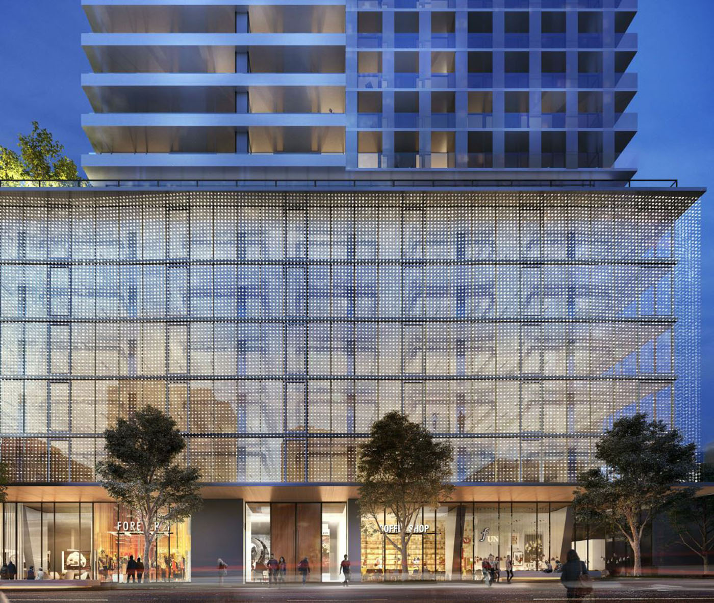 The podium facade will have a hanging “veil” in front of the offices. It appears to be made of metal discs suspended on wires. Westbank didn't specify details or how it relates to the project's public art component. Or it may be the public art.