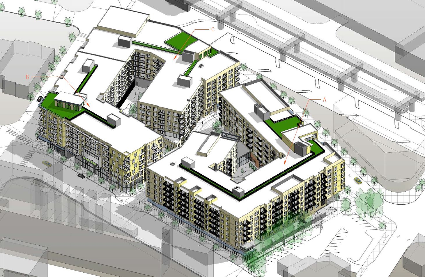 All three buildings will be six stories, with matching roof heights. To passersby, they would appear to be two irregular C-shaped structures.