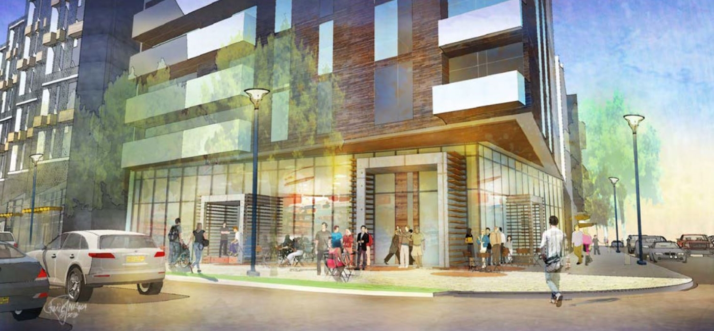 Plans filed with the city by Tiscareno Associates would divide the almost 3.5-acre Redmond Square site into east and west blocks, with a woonerf between them.
