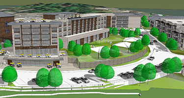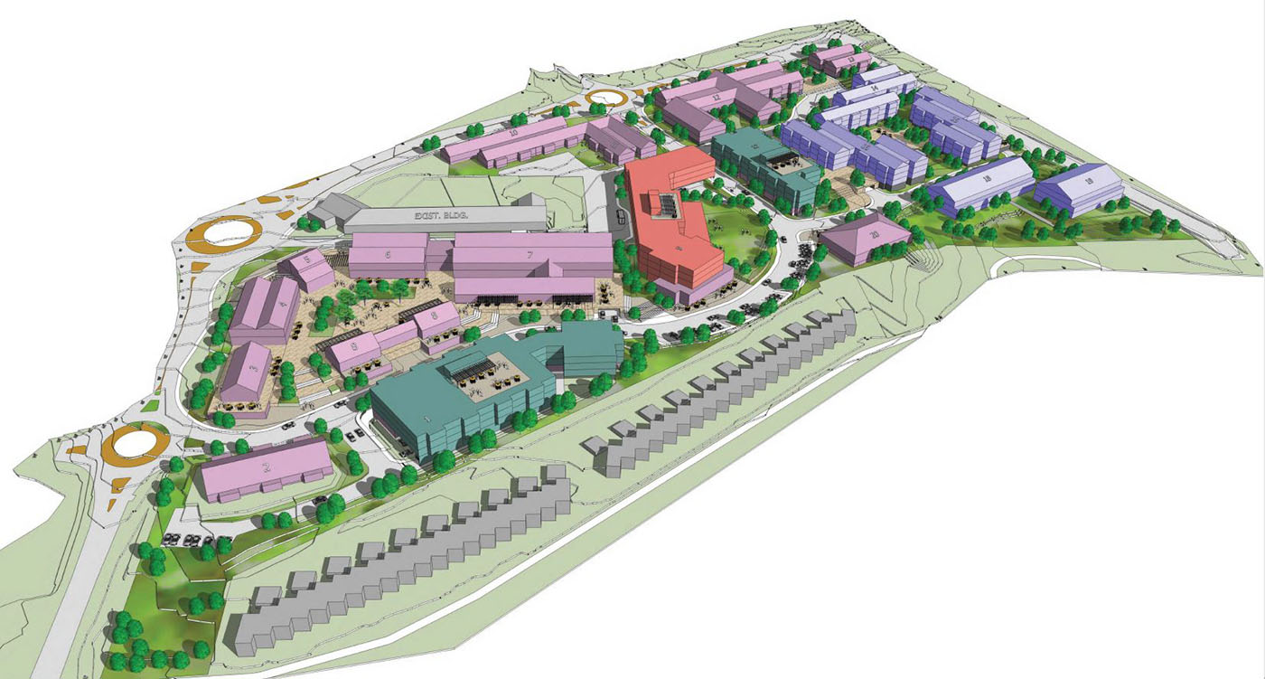 The Farmstead master plan looking east, with The Vines hotel depicted in red. The older Villas apartments (gray) are in the foreground, facing the Sammamish River.