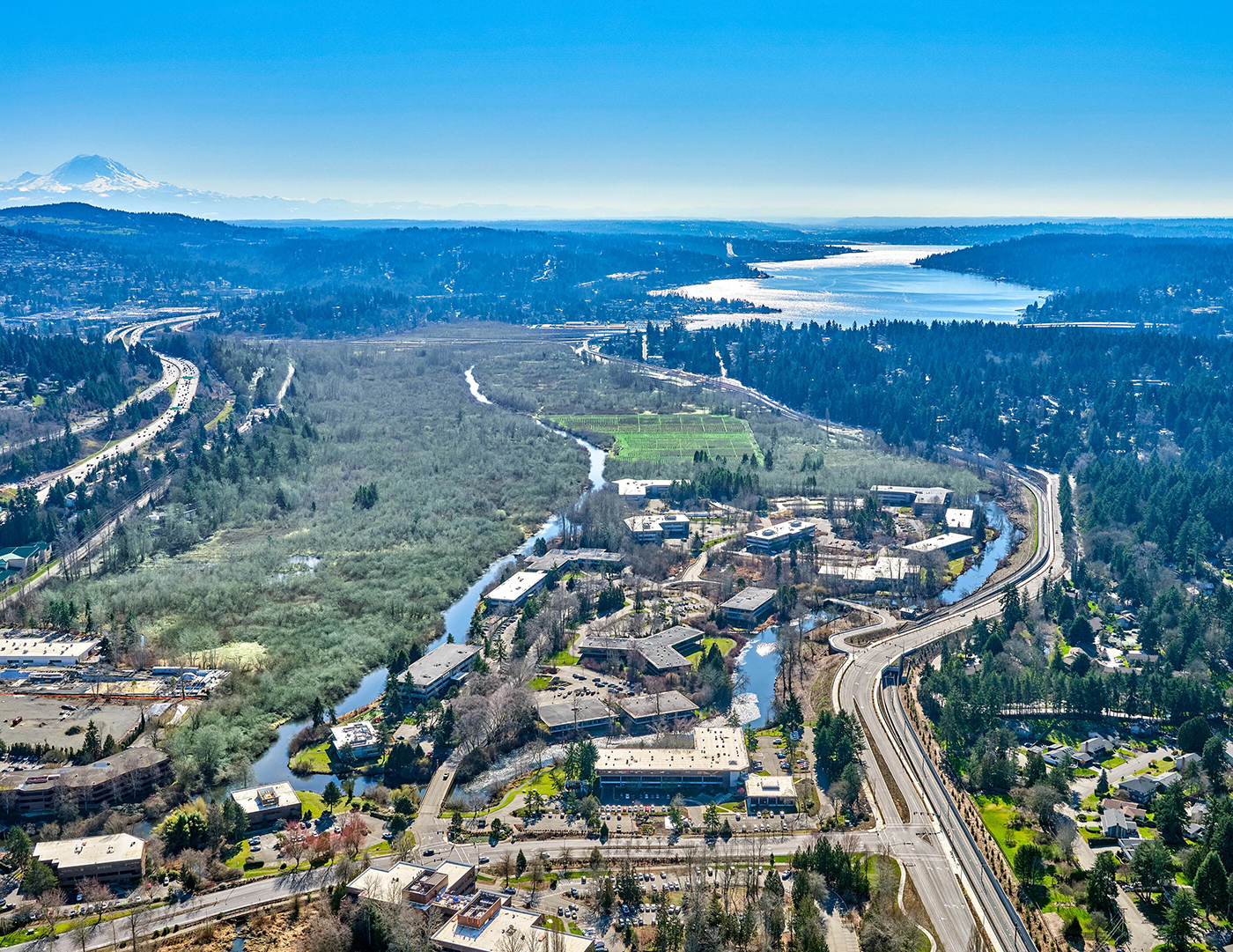 What the Yarrow Bay and Bellefield office parks have in common is their car-centric suburban office park vibe. You drive to work, past empty sidewalks, park in a secure garage, and never need to leave the campus during office hours. No one begs for change outside your lobby. Bellefield, just west of Interstate 405, does have the virtue of being near the Wilburton Park & Ride. But the 2 Line's light-rail stations aren't really near.